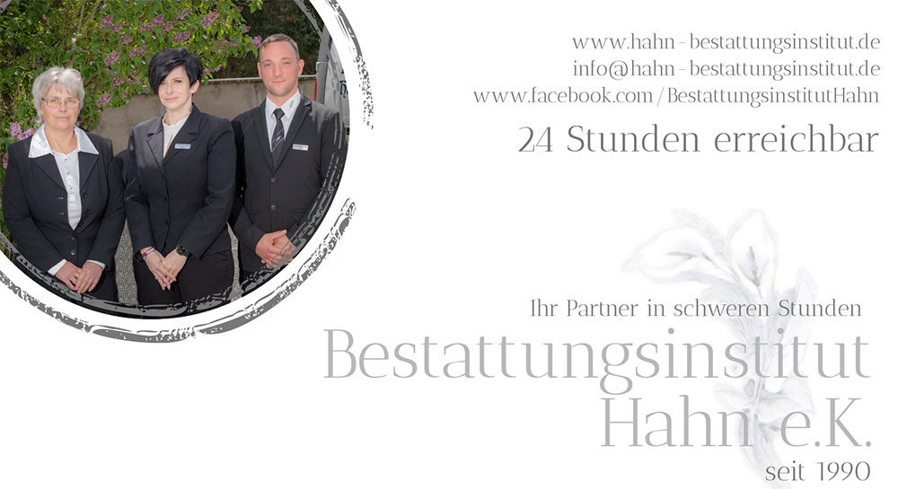 Jedes Leben ist einmalig – jeder Abschied auch . . . Wir, Ihr Bestattungsinstitut Hahn, unterstützen Sie in allen, den Trauerfall betreffenden Angelegenheiten, erledigen notwendige Formalitäten, sorgen entsprechnend Ihrer Wünsche für eine pietät- und würdevolle Versorgung des Verstorbenen und begleiten Sie während der Zeit des Abschieds. Welche Dienstleistungen wir Ihnen im Einzelnen zur Verfügung stellen […]